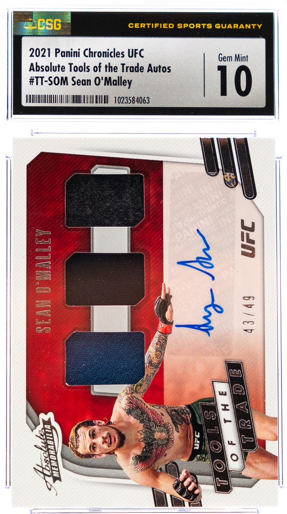 Consequently, whether you’re a die-hard O’Malley fan, a UFC card investor, or a collector chasing gem mint graded autos, this 2021 Absolute Tools of the Trade Auto /49 CGC 10/10 is a championship-level addition to your collection.