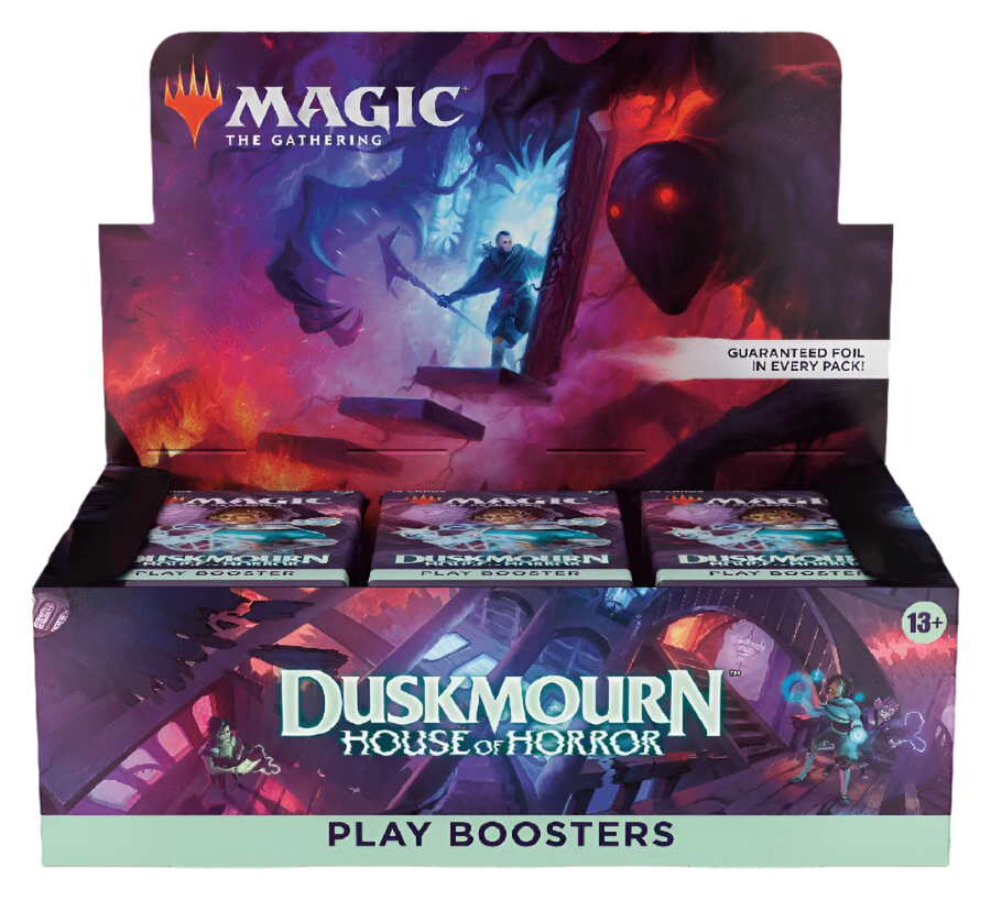 Dare to enter Duskmourn, a plane-enveloping House that sets the scene for your opponent’s greatest fears to come to life!Play Boosters are perfect for Limited play and fun to open, with a possibility of Art cards, alternate art, special frames, and additional Rares and/or Mythic Rares. Draft with friends, frighten up your deck, or find some Booster Fun! Look for 10 new Special Guest cards!Contents:• Each Duskmourn: House of Horror – Play Booster Box includes 36 booster packs, each contains 14 cards and 1 Token/Ad card or Art Series card• Each Play Booster contains 1–4 cards of rarity Rare or higher, including the possibility of a Borderless Mythic Rare card from Magic’s history• very booster also includes at least 1 shining Traditional Foil card of any rarity; in 20% of packs you’ll also find a Traditional Foil Land card