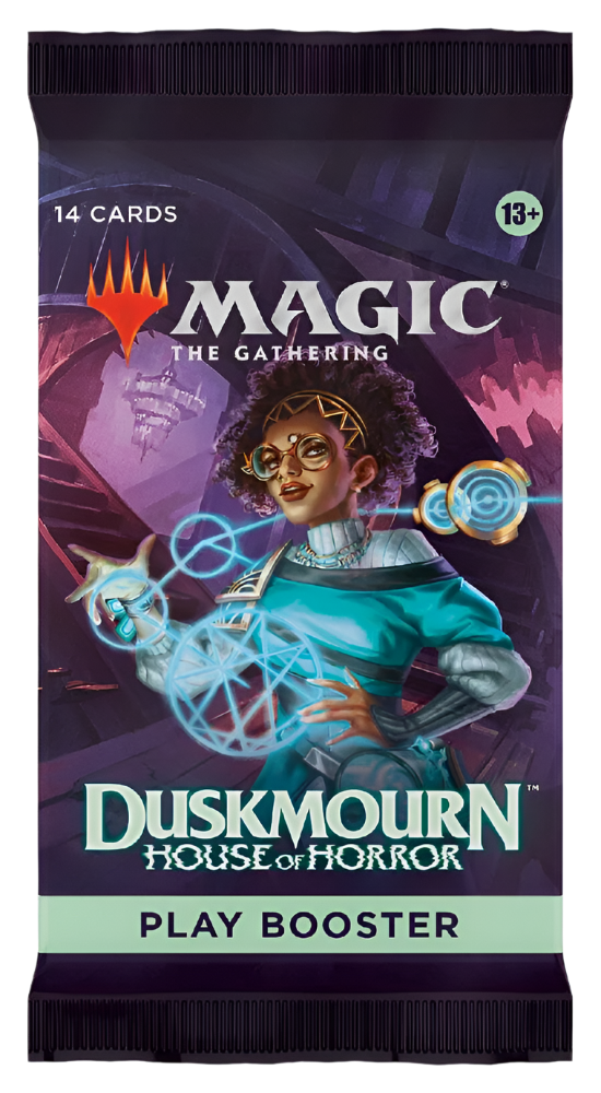 Dare to enter Duskmourn, a plane-enveloping House that sets the scene for your opponent’s greatest fears to come to life!Play Boosters are perfect for Limited play and fun to open, with a possibility of Art cards, alternate art, special frames, and additional Rares and/or Mythic Rares. Draft with friends, frighten up your deck, or find some Booster Fun! Look for 10 new Special Guest cards!Contents:• Each Duskmourn: House of Horror – Play Booster Pack contains 14 cards and 1 Token/Ad card or Art Series card• Each Play Booster contains 1–4 cards of rarity Rare or higher, including the possibility of a Borderless Mythic Rare card from Magic’s history• very booster also includes at least 1 shining Traditional Foil card of any rarity; in 20% of packs you’ll also find a Traditional Foil Land card