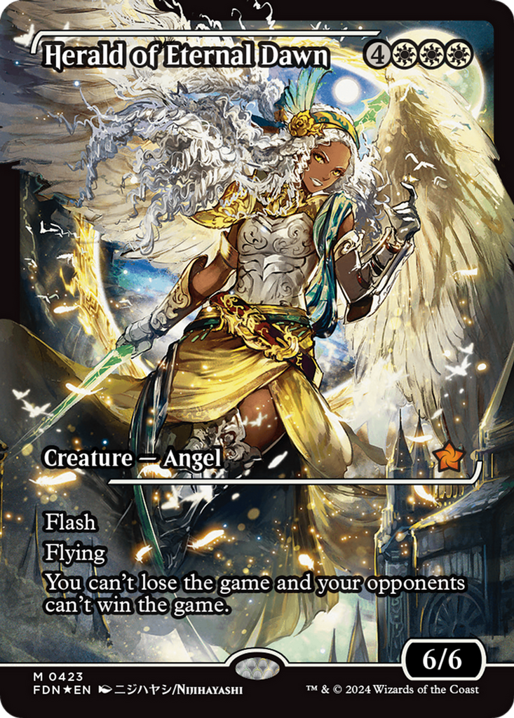 FlashFlyingYou can’t lose the game and your opponents can’t win the game.Rarity:M#:423Card Type:Creature — AngelP / T:6 / 6Casting Cost:4WWWArtist:Nijihayashi