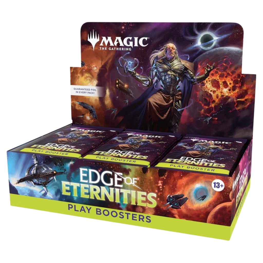 At the edge of the known Multiverse, a star system teeters on the brink of disaster. Chart a course through Sothera and explore distant planets, wield dazzling magic, and wage war with alien factions. Just steer clear of the unstable supervoid at the center of the system—unless you choose to harness the vast chaotic energies within!Play Boosters are the best way to discover all that Magic has to offer. Construct a deck out of your favorite color combinations, draft packs with friends, and open gorgeous Borderless cards—plus you can find a foil in every booster. A full display of Play Boosters supports a Draft event with extra left over to maximize the fun for everyone!Contents:• Each Edge of Eternities Play Booster Display contains 30 Play Boosters• Each Play Booster contains:• 14 Magic: The Gathering cards• Play Boosters may contain these cards: EOE 1–316; EOS 1–45; SPG 119–128• Includes 1–4 cards of rarity Rare or higher (2: 30%; 3: 3%; 4: <1%) and 3–5 Uncommon, 6–9 Common, and 1 Land cards• 1 card of any rarity is Traditional Foil• Foil Borderless Mythic in <1% of boosters• Traditional Foil Land replaces a Land in 20% of boosters
