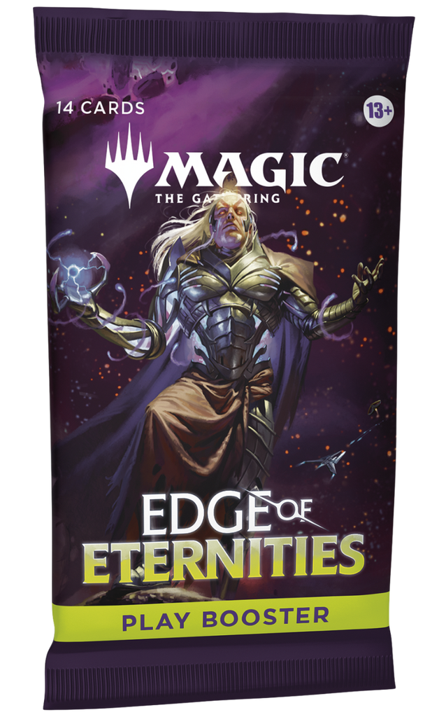 At the edge of the known Multiverse, a star system teeters on the brink of disaster. Chart a course through Sothera and explore distant planets, wield dazzling magic, and wage war with alien factions. Just steer clear of the unstable supervoid at the center of the system—unless you choose to harness the vast chaotic energies within!Play Boosters are the best way to discover all that Magic has to offer. Construct a deck out of your favorite color combinations, draft packs with friends, and open gorgeous Borderless cards—plus you can find a foil in every booster. A full display of Play Boosters supports a Draft event with extra left over to maximize the fun for everyone!Contents:• Each Edge of Eternities Play Booster Pack contains:• 14 Magic: The Gathering cards• Play Boosters may contain these cards: EOE 1–316; EOS 1–45; SPG 119–128• Includes 1–4 cards of rarity Rare or higher (2: 30%; 3: 3%; 4: <1%) and 3–5 Uncommon, 6–9 Common, and 1 Land cards• 1 card of any rarity is Traditional Foil• Foil Borderless Mythic in <1% of boosters• Traditional Foil Land replaces a Land in 20% of boosters