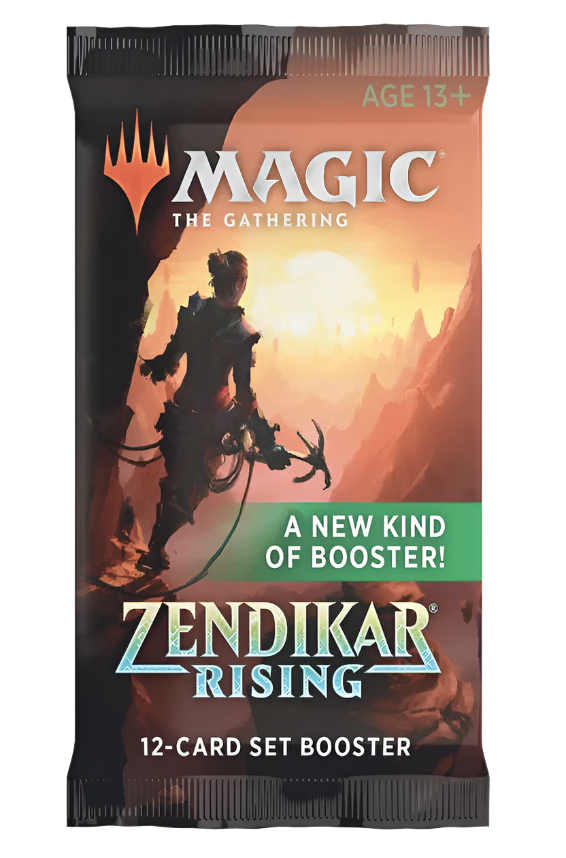 At least one foil in every pack. These can be any rarity, so this is one of several places where players can get a rare or mythic rare in a single Set Booster. Chance of multiple rares. Between wildcard slots, the rare slot, and the foil slot, there a several ways to get more than one rare in a Set Booster. Chance at The List*. 25% of the time, instead of an ad or token card, Set Boosters contain a card from The List* — interesting cards from anywhere in Magic’s history, printed as they appeared (including art, frame, and expansion symbol) plus a small Planeswalker symbol in their lower-left corner. Each Set Booster Pack contains 14 cards: • 1 Zendikar Rising art card • 1 Zendikar Rising full-art basic land • 6 Zendikar Rising thematically connected commons and uncommons • 1 Zendikar Rising “head-turning” card • 2 Zendikar Rising wildcard rarity cards • 1 Zendikar Rising rare or mythic rare • 1 Zendikar Rising guaranteed foil card • 1 token, ad card, or card from The List*
